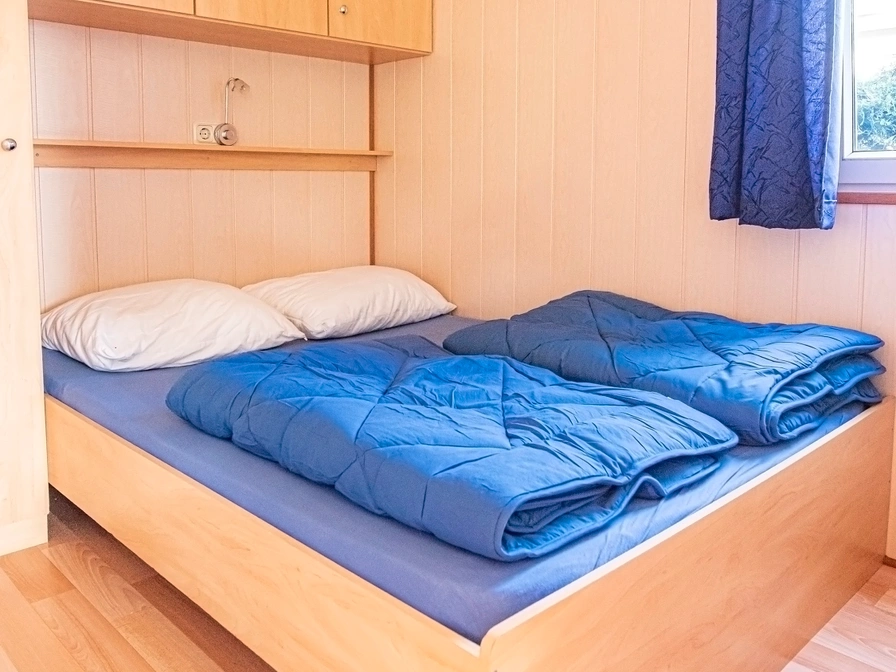 Chalet caravan of 30m2 is double-walled and well insulated. The chalets are located around a large playing field on the dune side of the campsite. There is a gas heater, digital television and Wi-Fi. On a small-scale campsite on Halfweg suitable for families and couples. The fields are bordered by trees. Living room with vinyl with 2-seater sofa and 2 chairs. Dining table with 4 chairs, kitchenette has a 4-burner hob, fridge, extractor hood, filter coffee maker and microwave. Bathroom with shower, toilet and sink. There are two bedrooms with a bedroom with 1 x double bed (140 x 200) with 2 x 1 person duvets and a bedroom with 1 x bunk bed (2 x 80-200). Children's furniture, such as a high chair, bed rack or a camping bed can be requested free of charge. Terrace with table with 4 chairs and a parasol. The middle ground is kept free for playing space.