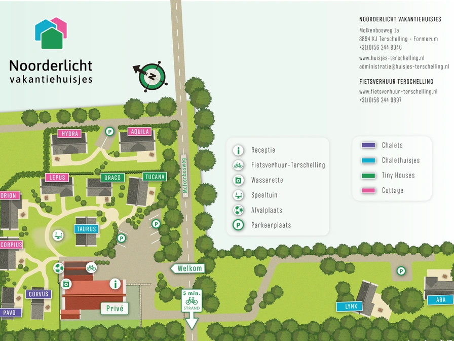 Free bus voucher when booking one of our houses and when renting our bicycles via www.fietsverhuur-terschelling.nl (min. € 35 per person per bicycle). Noorderlicht is centrally located on the island of Terschelling, north of the village of Formerum. It is seven kilometers from the boat. It is a child-friendly park. Young people would be better off looking for another place. (minimum age to rent a house independently is 21 years) Noorderlicht holiday park has accommodations for 1 to 5 people and you can choose between a chalet (30m2), cottage (45m2) or a Tiny House (40m2). The site is child-friendly with play equipment. A car can be parked in the parking lot. Laundry facilities are available. Linen, towels and kitchen towels can be rented. Bicycles can also be rented. The holiday park is pet-free. The reception is open until 6:00 PM. If you arrive later than this time, please contact us. Closed on Sundays. The minimum age to rent a house independently is 21 years. You can have the house cleaned, inquire at reception.