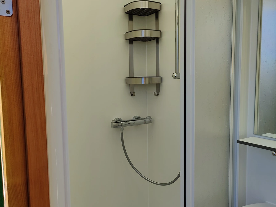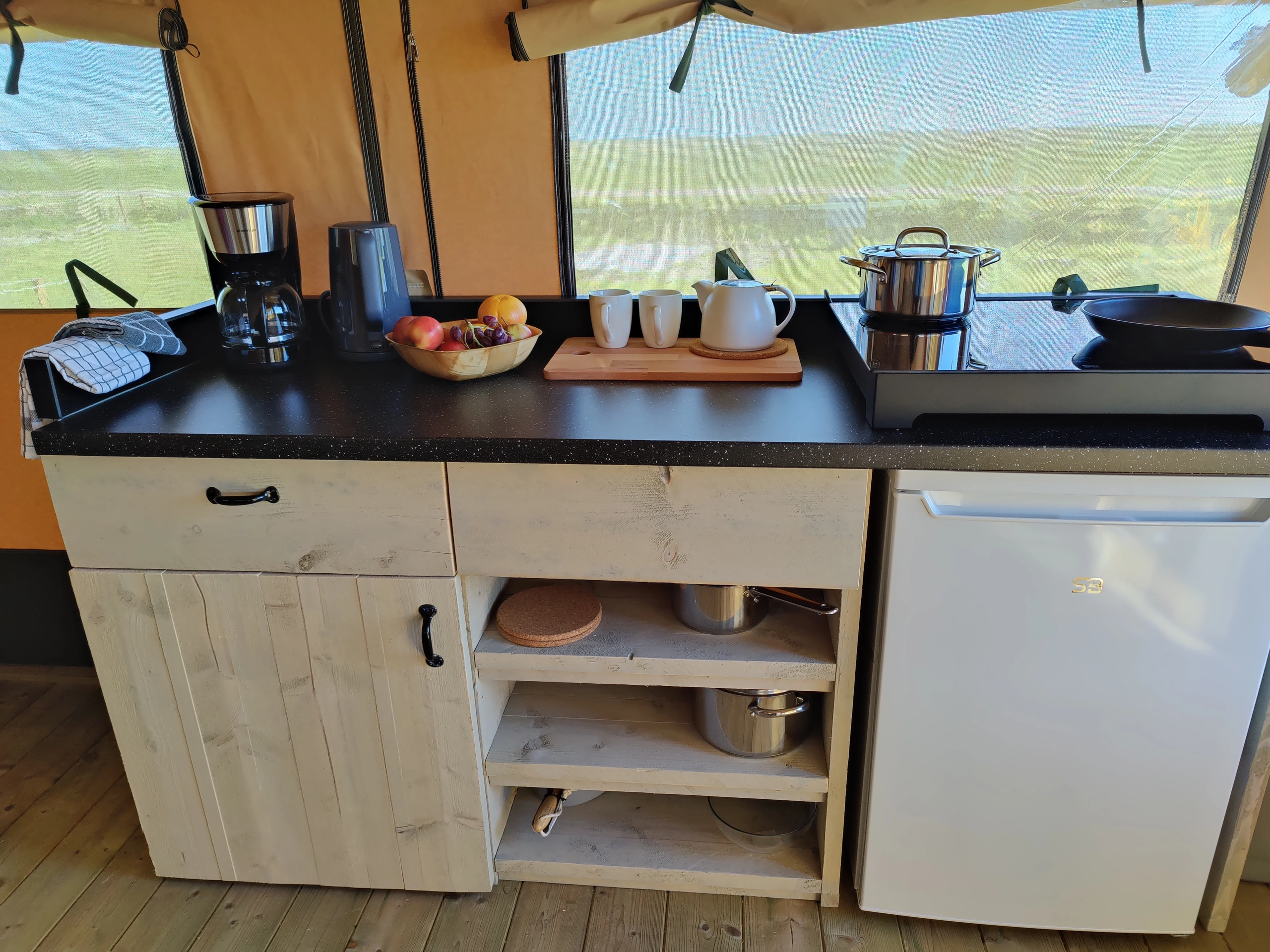 The furnished safari tent is fully equipped with a scaffolding wood kitchen unit featuring a 4-burner induction cooktop, kettle, refrigerator with freezer compartment, coffee filter machine, and crockery, plates, and cutlery. The sanitary unit has a sink and a tap for dishwashing. There's a large round table with two chairs and a seating area with two chairs and a beanbag chair. On the veranda, there's a picnic table where you can enjoy breakfast or simply enjoy the view. There's one sleeping cabin with two single beds (80 x 200 cm). The sanitary unit is located between two tents and is for your private use. It includes a toilet, shower, sink, hairdryer, and heating.