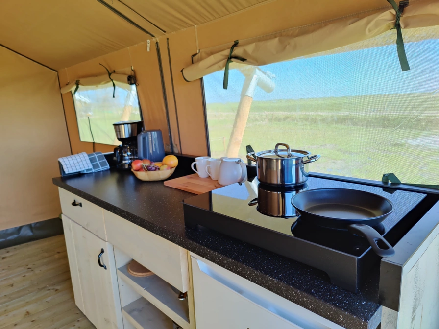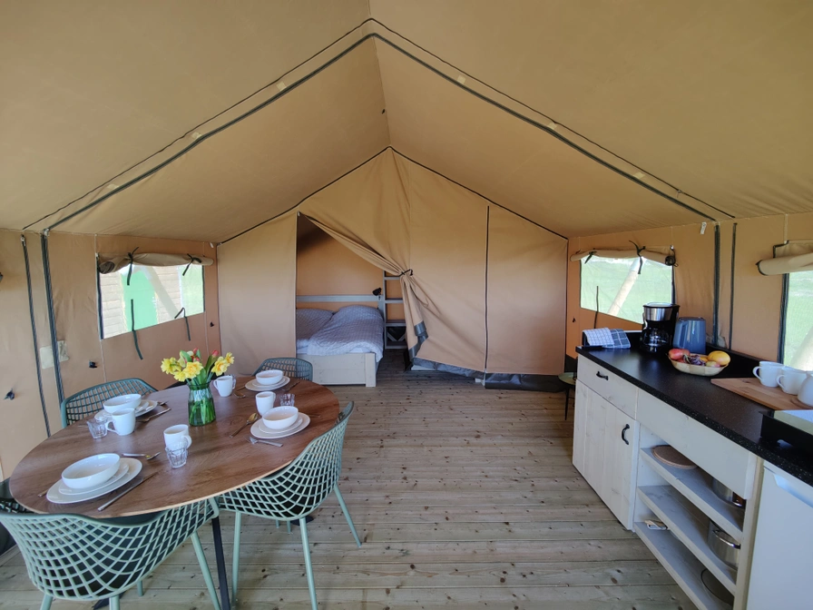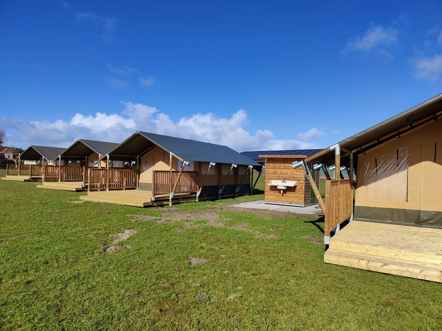 Small farm campsite on the south side of Hoorn with 8 furnished safari tents. Each tent has its own sanitary facilities behind the tent. The sanitary facilities consist of a toilet, shower, sink, hairdryer and heating. In safari tents number 4 and 5 it is possible to add a 2-person tent. You have a view over the polder landscape towards the Waddendijk.