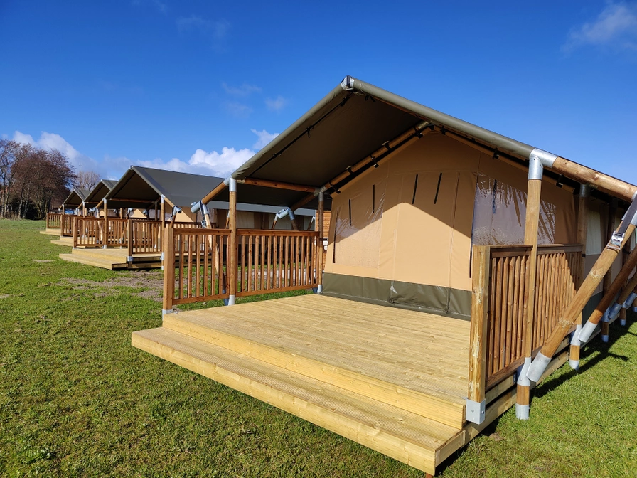 There are 8 furnished safari tents at the farmer's campsite Overal Wat in Hoorn. Each tent is 4 by 6 meters with a terrace of 4 by 3 meters in front and has its own sanitary facilities next to the tent. Each tent has its own section of a 2-part sanitary unit, which is placed between these two tents. The sanitary facilities consist of a toilet, shower, sink, hairdryer and heating. In safari tents number 4 and 5 it is possible to add a 2-person tent. The field is 60 by 65 meters. The safari tents are on the edge of the field, 4 on the east side and 4 on the west side.
