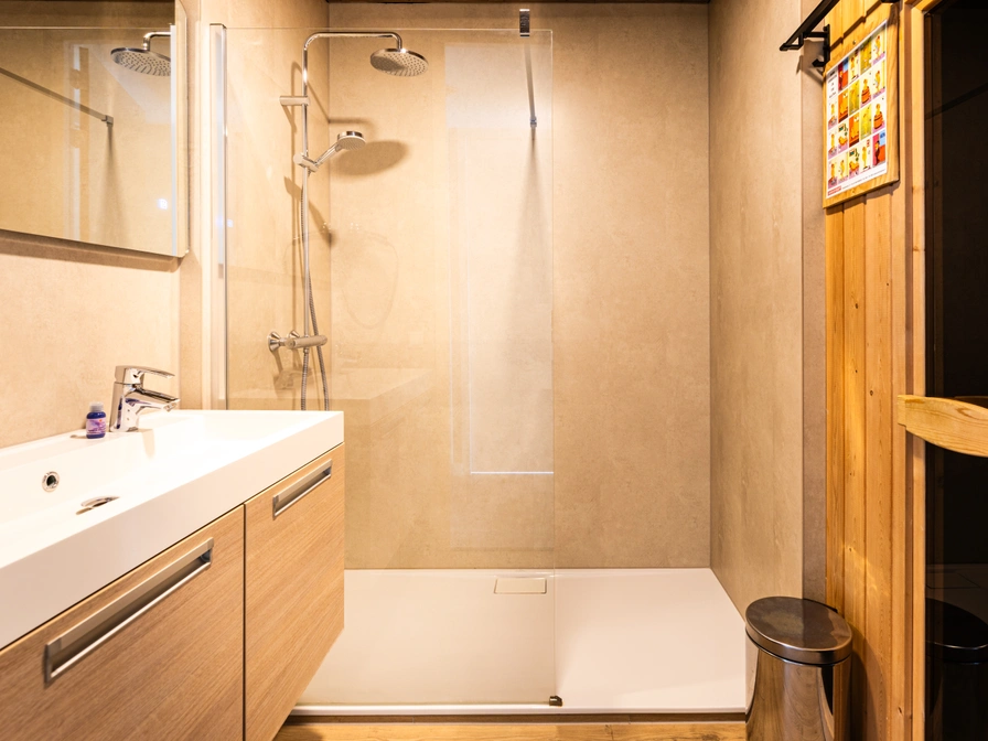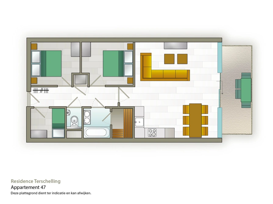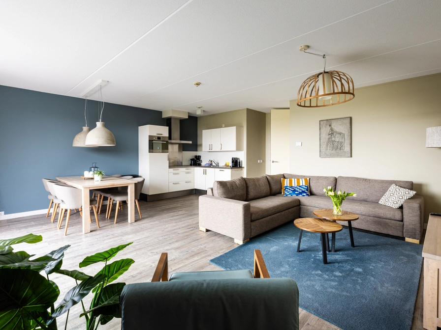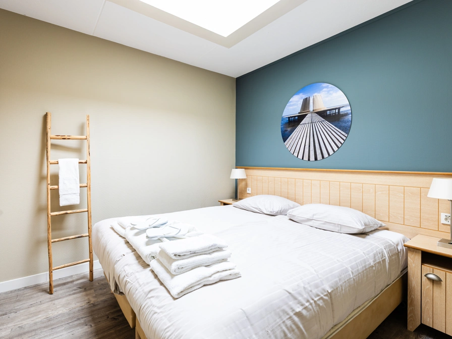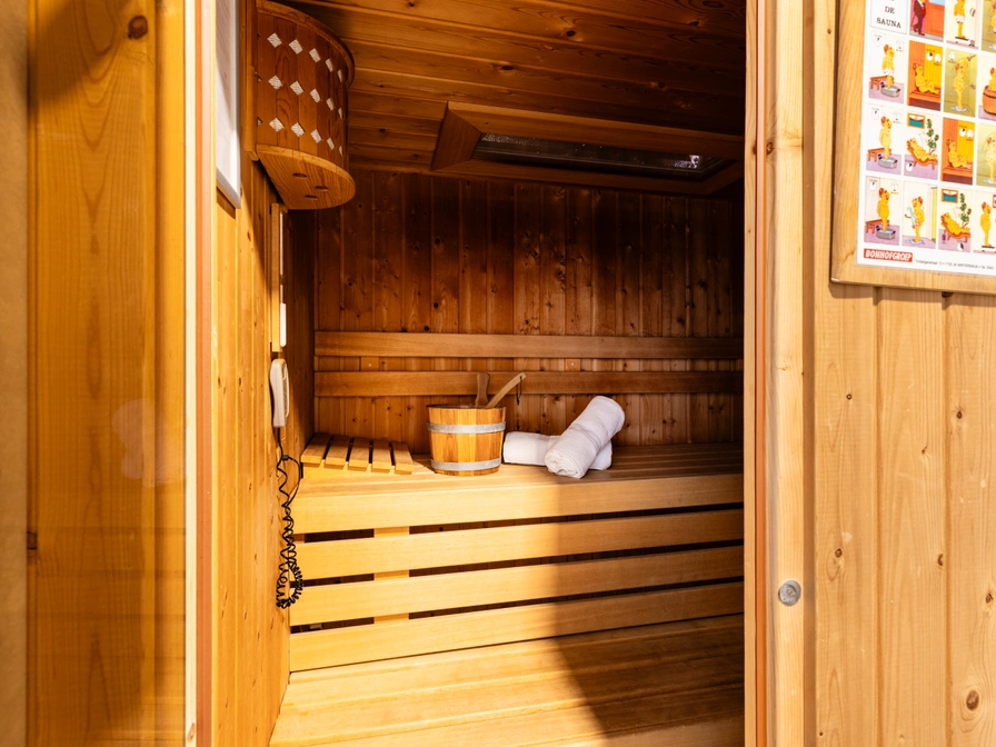This pleasant three-bedroom apartment with a private sauna is exactly what you are looking for! Enjoy space and tranquility in the 5-person apartment with a sauna – perfect for groups of friends, families with three children, and more. This very spacious apartment of approx. 90 m² features three bedrooms, a stylish living room with a smart TV, a modern bathroom with a delightful private sauna, and a fully equipped kitchen. The kitchen includes a combination microwave oven, a hob with cooking utensils, crockery, a kettle, a Nespresso machine, and a filter coffee machine. Additionally, you can enjoy the view over Midsland from your spacious balcony! Depending on the location, the apartment features either a bath or a shower – feel free to let us know your preference (subject to availability). The box-spring beds are made upon arrival, towels are ready, and you can make free use of the resort's wellness facilities. Thanks to the skylights, you can even enjoy the starry sky in the evening. Central location, comfort, and relaxation – that is the 5-person apartment with a sauna. Spacious and comfortable apartment (approx. 90 m²) Three separate bedrooms - perfect for 5 people or groups looking for a bit more space Private sauna & modern bathroom with bath or shower Free use of indoor pool and wellness facilities Central location between the beach and the city center Skylights with a view of the starry sky Please note: this apartment type is located only on the second floor. For a preference for a specific apartment number or a preference for a bath or a shower, we charge a preference fee of €40.00.