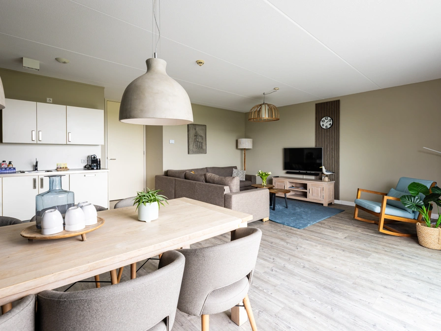 Near the charming village of Midsland, within walking distance of the North Sea beach, lies Résidence Terschelling **** Waddenresort. This modern resort offers everything for a carefree holiday. Take a dip in the indoor pool with a toddler pool and whirlpool, unwind in the extensive wellness area with sauna and Turkish steam bath, or work on your fitness in the fitness room. You can also relax in the relaxation room, with the rain showers or foot bath. The contemporary apartments, some with views of the green courtyard or the expansive landscape, are comfortably and stylishly furnished. They feature a cozy living/dining room with a smart TV and a modern open-plan kitchen equipped with a combination microwave and dishwasher. The bathroom is complete with a bathtub, shower, and sink, and there is also a separate toilet. Enjoy the outdoors on your furnished terrace or balcony. Facilities at a glance: - Free Wi-Fi - Indoor pool, fitness center, and wellness center - Children's play area and playground - Atrium with seating area - Pool table, foosball table, and table tennis - Central elevator - Laundry room with washer and dryer (for a fee) The resort has 55 non-smoking apartments, suitable for 2 to 6 people. Pets are welcome upon request, subject to availability.